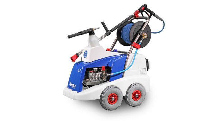 Levensmiddeluitvoering met slijtvaste blauwe hogedrukslang, robuuste, rotatiegegoten, zelfdragend chassis, schokbestendige behuizing uit ABS, drievoudige zuigerpomp met chroom-nikkel pompkop (warmwaterbestendig), hoogperformante keramische zuigers, inox kleppen, lekkage retour, start-stop systeem met vertraagde uitschakeling, totale uitschakeling na 20 min, drukregelaar voor traploos aanpasbare druk en debiet, 4 grote rubberen wielen slijtvast grijs, stockagemogelijkheid voor toebehoren, robuuste aan-uit draaiknop, 7,5m snoer met stekker, afneembare ergonomische duwbeugel.